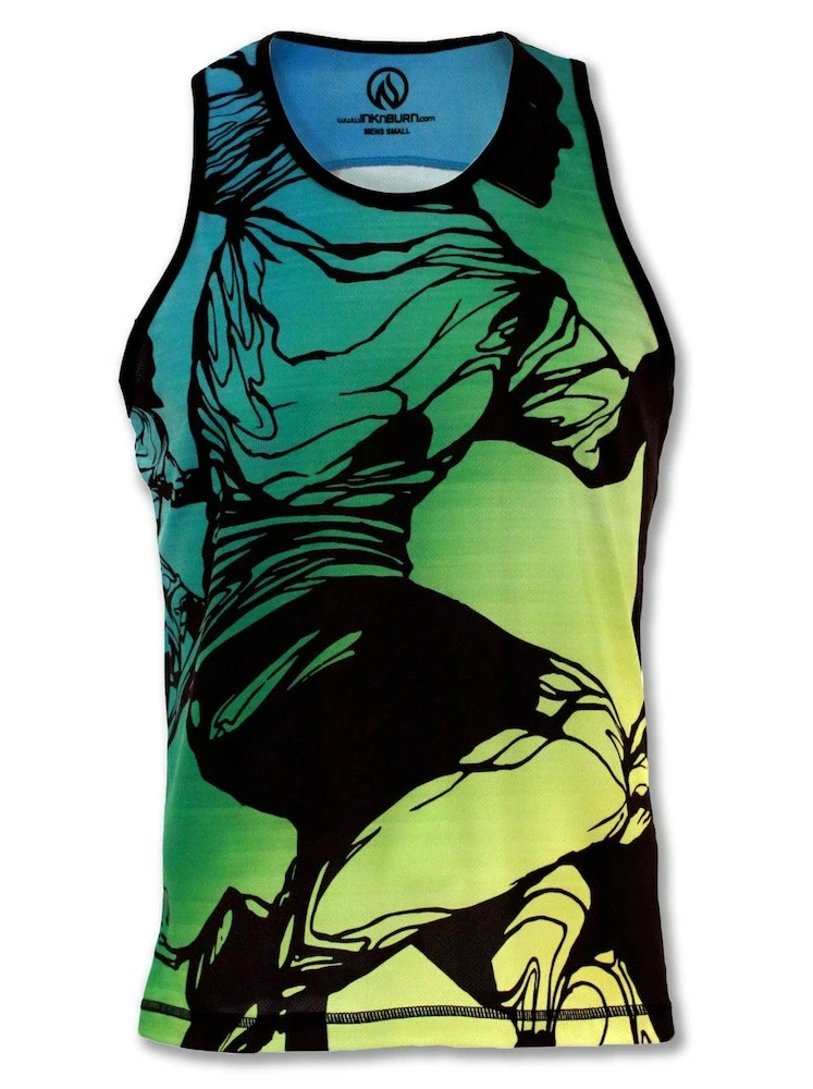 This Men’s Motion Singlet is all about movement, speed and nature. Inspired by those moments when you feel so powerful and invincible, like your feet are flying and the scenery is a blur around you. The background is composed of vibrant nature colors and is sharply contrasted by the clean black-inked style of the foreground.