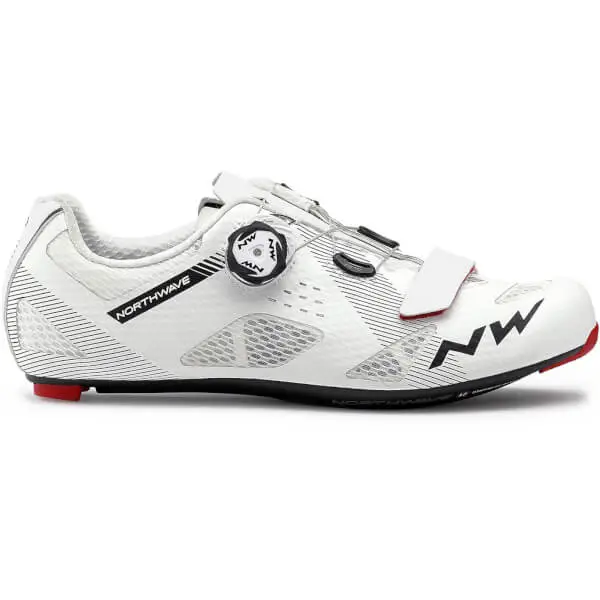Designed to give you more power at the pedals than ever before, the Storm Carbon Road Shoes from Northwave is a comfortable footwear experience that will make you feel like a pro every time. Built with plenty of support through every twist and turn of the road, the Northwave Storm Carbon Road Shoes are all you need for a lifetime at the pedals. Starting at the bottom, you’ll find the industry-leading Morph Carbon 12AAS sole, featuring a more developed full carbon layer that packs in the direct power transfer ensuring responsive feedback, without adding any extra weight to your set up. Between the layers of carbon, you’ll find the slightly more flexible TPU foot arch support that adapts to your individual foot needs. Moving further up the shoe, the overall construction is genuinely a thing of wonder. Biomap Unibody technology allows a whole heap of breathability via micro perforations that wicks sweat away from the skin, elasticity for freedom of movement and unbeatable protection. The Storm Carbon shoes provide a dialled fit thanks to the SLW 2 system closure, and additional Velcro® straps give you extra security. Features Morph Carbon 12 AAS sole with 100% carbon insert in the pedal area and stiffness index 12.0. The unique Anatomical Arch Support®, in TPU, allows the shoe to perfectly model itself on the arch, making the sole ideal for any type of foot Compatible with NW Speedplay adapter for the shortest distance foot-pedal Unibody construction fuses large inserts on the web in strategic areas with reinforced materials with ultra-thin thickness. The result is unrivaled breathability and targeted stability Extremely open meshed mesh further increases airflow The decentralized lacing removes pressure on the back of the foot ensuring optimal winding SLW2 rotor with extra strap: the only one with step-by-step and complete release in a single button Performance Regular insole for greater plantar support