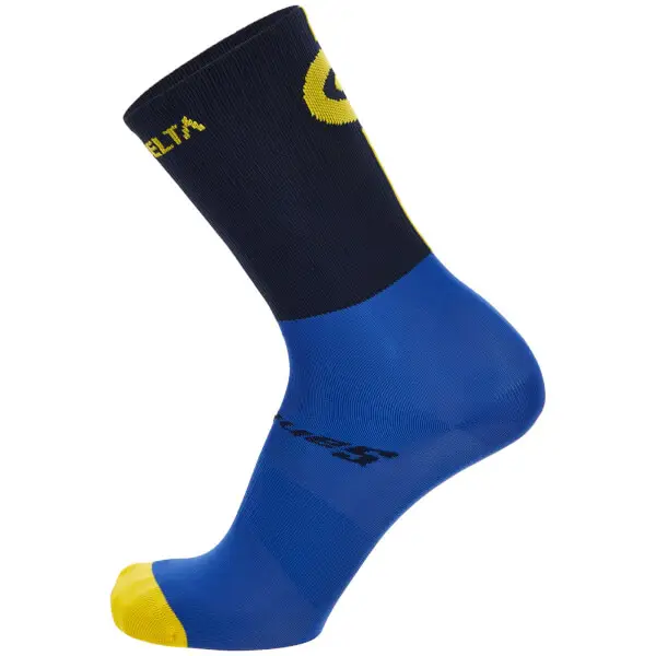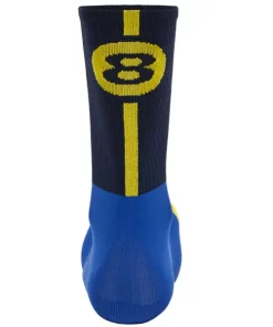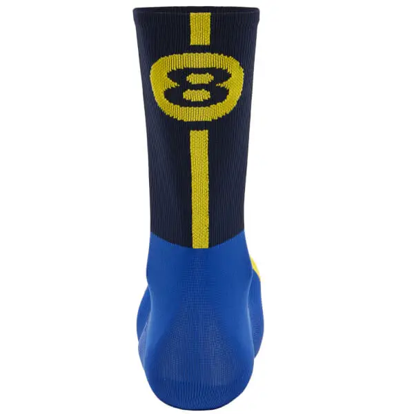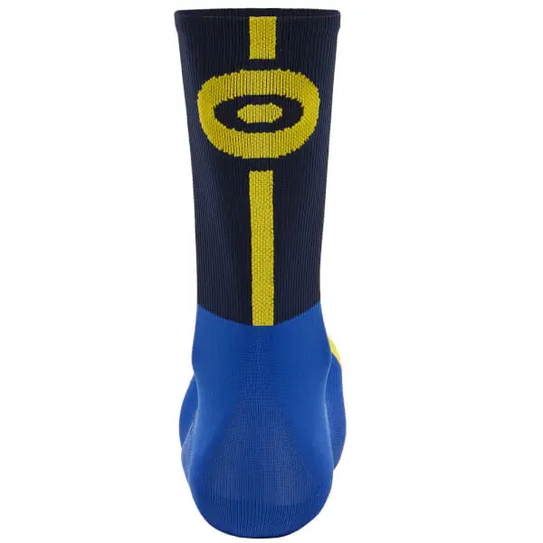 High profile cycling socks. The design draws influence from the distinctive blue and yellow colours of the regions flag, and the iconic Victory Cross emblem synonymous with Principality of Asturias.