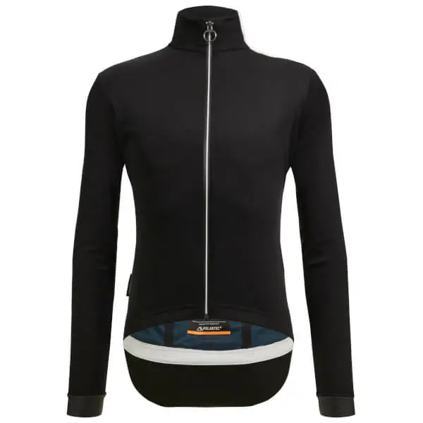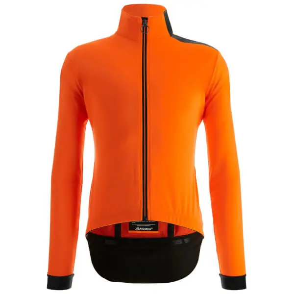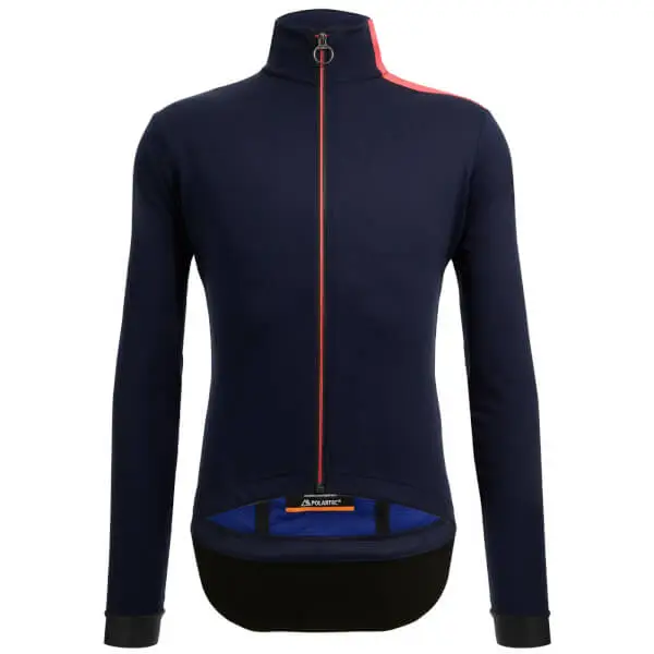 Extreme Rain Protection Winter Jacket With Hood All-weather winter jacket. Vega Multi is designed to guarantee complete thermal balance in any climate conditions. Ideal for cold rides and very wet weather. Innovative water resistant hood that can be folded in to the collar. EXTREME RAIN PROTECTION Made of totally waterproof (5000 mm water column) POLARTEC®’s Powershield Pro fabric. Microporous membrane that easily releases excess heat and moisture vapor to keep you dry inside and out. Ideal for very wet weather, the jacket is completely thermowelded and it features an additional zippered and waterproof rear pocket lined with a breathable membrane fabric. ENHANCED FIT AND INSULATION Ergonomically-cut waterproof sleeve cuffs and tail made from fleece-lined Superoubaix fabric, with a fully waterproof PU outer layer to repel water. Waterproof internal zipper flap. INNOVATIVE WATER-PROOF HOOD Elasticated water-proof hood for extra protection during rainy conditions. The hood is stored inside the back collar and can esily be taken out in case of rain. Made to be worn on top of your helmet to make sure your head stays as dry as your body. It fits most helmets currently on the market. HIGH VISIBILITY Reflective shoulder band, back inserts, and reflective Santini logo ensure maximum safety in low visibility.