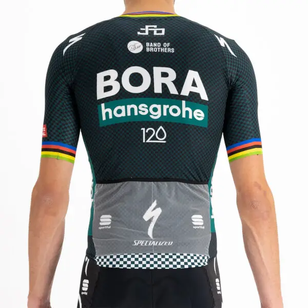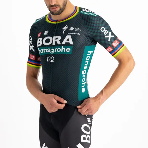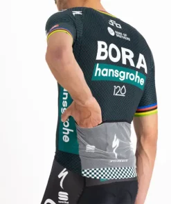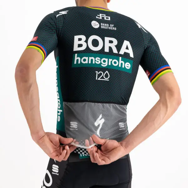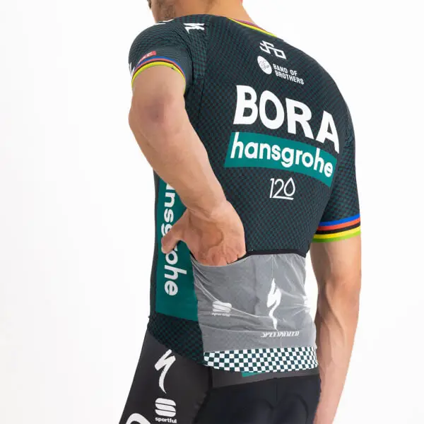 There are days when the BORA- hansgrohe pros opt for a more classic approach rather than a skinsuit. Their request was simple: separate the Bomber Suit into a jersey and shorts. Which is exactly what we’ve done. The Bomber Jersey maintains all the key features developed for the skinsuit: a single panel of fabric without seams on the shoulders, sleeves in raw-cut mesh, YKK® zipper for one-handed opening. The back pockets are even more stable, if that’s possible, thanks to the elastic we added to “close” the jersey, and we kept the two race-number compartments. The result is our best-performing jersey for road racing.Smooth, stretchy polyester fabric with more structure on back Sleeves in compact stretch fabric 3 open pockets with gusset for increased capacity and micromesh number holder Full-length YKK® Camlock® zip for easy opening with one hand