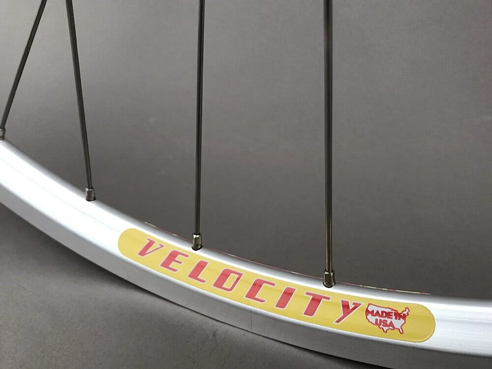 New Velocity Silver Dyad 32 Hole Rims – 18.6mm Inner Width, 24mm outer width, shaped like their A23 rims but thicker all around. Machined braking surface.