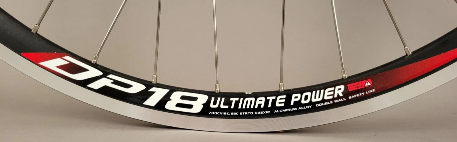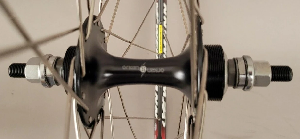 New Weinmann DP18 black rims with 36 spokes and Formula loose ball bearing hubs with Origin8 logo